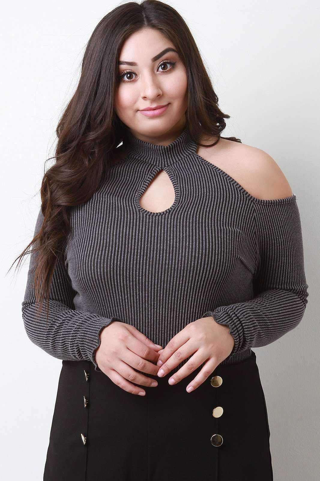 Ribbed Knit Cold Shoulder Mock Neck Keyhole Top